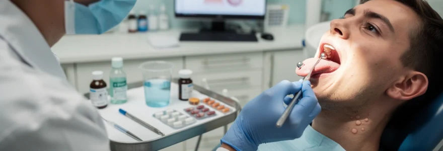 En cas de suspicion d’infection mixte ou de surinfection anaérobie (halitose marquée, douleur profonde, nécrose débutante), le métronidazole peut être prescrit en association. Ce médicament cible spécifiquement les bactéries anaérobies et certains protozoaires, complétant ainsi l’action de l’amoxicilline-acide clavulanique. L’objectif est de réduire rapidement la charge microbienne et d’éviter la progression vers un abcès profond ou une cellulite cervico-faciale.